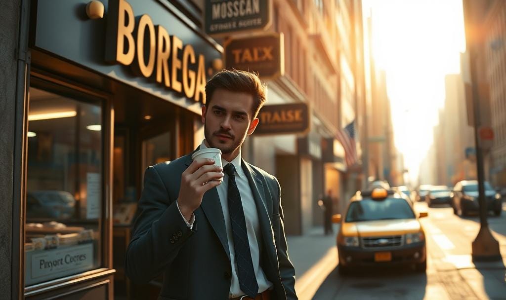 Still rubbing his eyes, the needles of sunlight finding their way between the rows of concrete block, as the sun rises on the city… stopping at the bodega, he grabs a coffee, then hailing a cab, he heads to the airport…